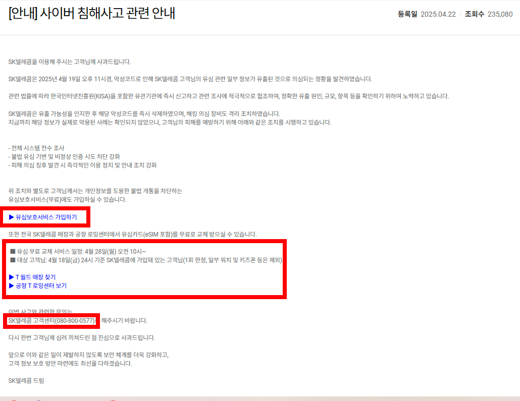 이와 더불어 사용자분들께서는 SKT 유심보호서비스 신청을 통해 추가 해킹 방지 보호 절차를 완료하여 개인정보 추가 유출 차단 조치를 시행하시길 권장드립니다.